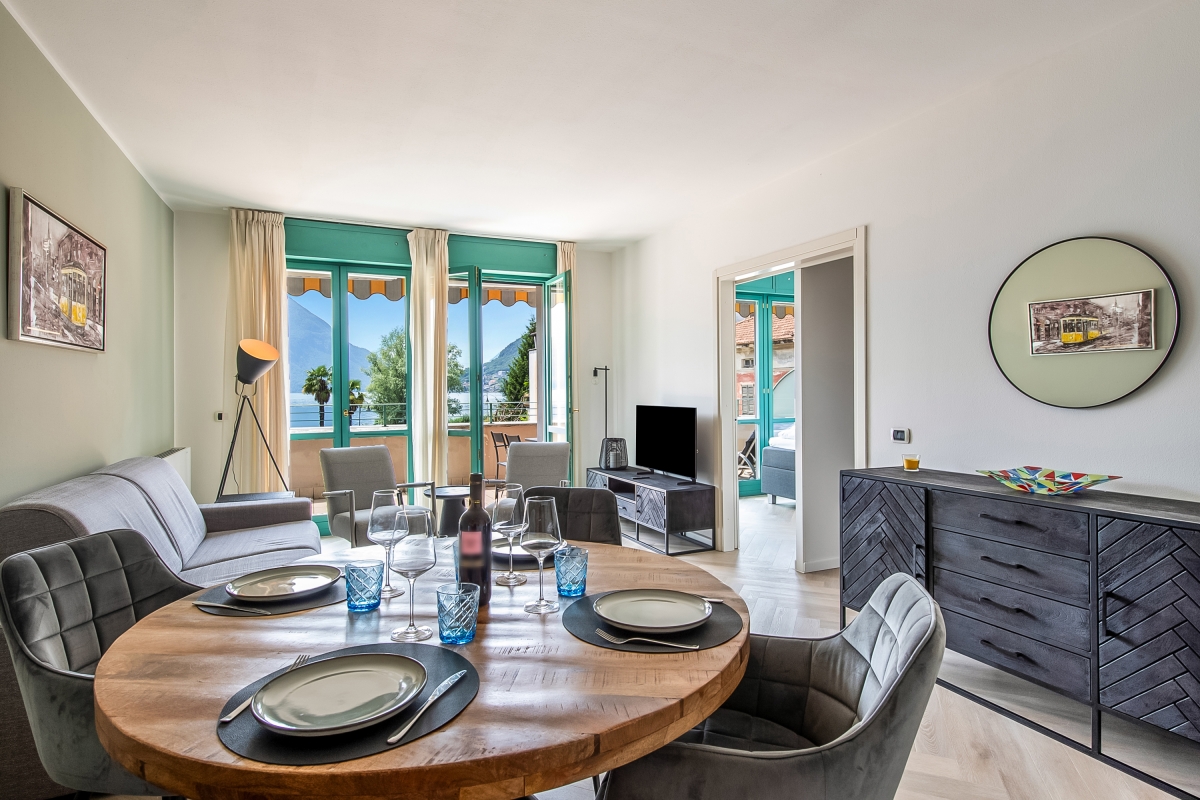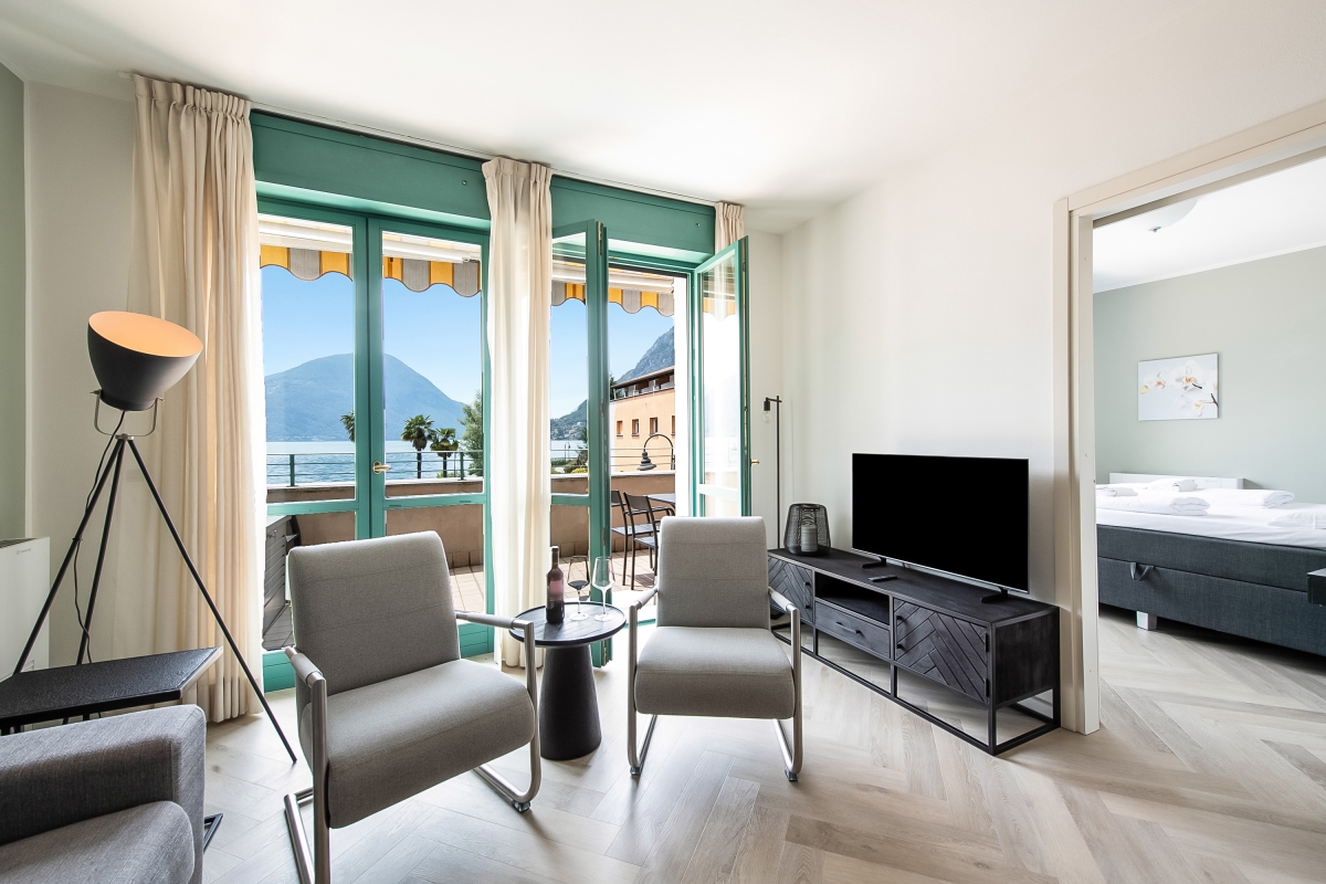 Situated on the 1st floor of the Palazzo building in Porto Letizia, this modern lake view apartment is perfect for flexible group stays. The air-conditioned retreat is pet-friendly and is fully-equipped for carefree self-catering holidays; with a spacious lake view open plan living room furnished with a double sofa bed, SAT TV, DVD player and a newly-fitted corner kitchen with dining area. A double lake view bedroom with terrace access is accompanied by a 2nd double bedroom. A large family bathroom fitted with a modern bath tub, overhead shower, heated towel rack, wash basin, WC and bidet complete the apartment’s internal layout. Outside, the lake view balcony is furnished with a pair of sun loungers and an alfresco dining set. Key features- • SAT TV • DVD player • Free WiFi • Nespresso coffee machine • Dishwasher • Pet-friendly • Air-conditioning • Central heating • Clothes horse • Fan • 2 sun loungers • Sunny balcony terrace • Alfresco dining set • Lift access • Communal resort facilities • On-site coin-operated launderette Location: Located in Porlezza on Lake Lugano, the holiday apartment is situated in the main Palazzo building of Porto Letizia. The modern Palazzo enjoys an on-site reception, stylish café bar, contemporary Panama Italian restaurant and more. During the months of July and August there is also a kids’ entertainment program. The family-friendly resort also features a shared public park with meandering footpaths, a communal beach with SUP and watersport hire, two childrens’ play areas. From the resort’s central location along ‘Via Prati’, guests will easily be able to reach the town amenities, the bus and ferry links and the main lake road of Porlezza (2-5 minutes’ walk away). Perfect for a fun and varied holiday on the Italian-Swiss Lakes, the resort is within easy driving distance from the year-round lake capital of Lugano and the picturesque small city of Menaggio on Lake Como (22-28 minutes’ drive away).